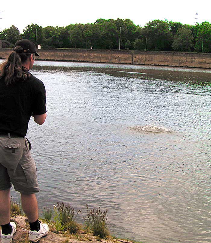 Noch bevor wir an das Wasser kamen wussten wir schon, dass die Strömung an der Stelle, die wir ausgesucht haben ziemlich "hart" war. Wir wollten direkt unter einer Schleuse fischen, wo das Wasser recht schnell floss. Obwohl Tomi die Stelle kannte haben wir loten müssen, um eine Rinne oder eine Unebenheit zu finden an der sich die Nasen überwiegend aufhalten. Nach längerem Loten fanden wir endlich das was wir suchten. Ich hatte noch meine 11 m. Steckrute dabei und entschloss mich in einer Entfernung von ca. 10 m. von dem Ufer zu fischen, wo das Wasser etwas langsamer floss und Tomi fischte in einer Rinne, die gerade ca. 5 m. von dem Ufer weg war mit natürlich deutlich stärkerer Strömung wie bei mir. Dann sind zwei Entscheidungen gefallen was die Futterkampagne betrifft, nämlich Tomi wollte grössere Kugeln füttern, die auch etwas fester gedrückt waren, in deren Mitte er noch ein Stein reindrückte um an Gewicht zu bekommen. Er fütterte eine Stelle punktgenau um die Fische auf einem kleinen Raum zu behalten. Ich machte kleine Kugeln, Steine ließ ich weg, fütterte fluss-aufwärts und habe versucht eine längere Spur anzulegen, so dass ich meine Montage über längere Stecke treiben lassen kann, um mir die Chance auf einen Biss zu erhöhen.