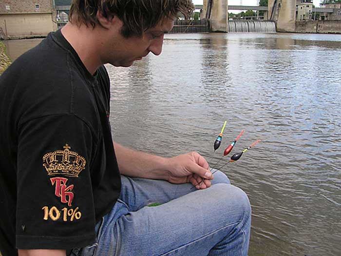Um die Montage perfekt führen zu können und in jedem Moment den Kontakt mit ihr zu haben, fischten wir mit Bolloruten in der Länge 6 und 7 m. Ich angelte auch noch mit meiner Steckrute mit einer Länge von 11 m. Unsere Montagen sahen so aus: Hauptschnur mit Durchmessern in 0,14 und 0,18 mm. Posen TK System of Glory für fließenden Gewässern mit einer Tragkraft von 3 gr. Hauptblei war ein Laufblei, 2,5 gr., tropfenförmig mit, aus Silikon, schnurschonender Innenführung. Dazu 4 Schrottbleie und zwar 2x 0,02 g und 2x0,008 g. Vorfächer mit Durchmessern 0,10 und 0,12 mm und 20 bis 35 cm. Länge. Haken in der Grösse 12, 14, 16. Bei einer Montage sind viele kleine Details zu beachten und zwar: Während Sie die Pose montieren, achten Sie darauf, dass sich am Kiel der Pose Minimum drei Stücke Posenschlauch befinden um die Pose optimal zu fixieren. Ein Stück von dem Posenschlauch schieben Sie am Kiel entlang bis zu dem Posenkörper, das zweite Stück fixieren Sie in der Mitte des Kiels und das dritte Stück am Kielende, so dass die Kielspitze ein wenig bedeckt wird. So vermeiden sie unerwünschtes Verstellen der Tiefe und Verhedderungen der Montage. Achten Sie darauf, dass die Hauptschnur an einer Seite der Pose verläuft und nicht um den Posenkörper oder Posenkiel gewickelt wird, weil bei einer Verstellung der Tiefe könnte es zur Beschädigung der Schnur kommen. Das Hauptblei montiere ich 30 cm oberhalb der Schlaufe, an die das Vorfach kommt. Das Hauptblei (Laufblei-tropfe-2,5 g.) wird mit einem Schrotblei 0,2 g gestoppt. Die restlichen drei Schrote befestige ich an der Hauptschnur mit einem Abstand von 10 cm. voneinander und zwar so dass das zweite Schrot, 0,2 g., 10 cm. unterhalb dem Schrot, dass das Hauptblei hält, fixiert wird. 10 cm. weiter nach unten kommt das dritte Schrot 0,008 g. und das vierte kommt direkt an den Schlaufenknoten. Die Tiefe stellten wir so, dass das Vorfach immer am Grund schleift. Wegen Unebenheiten schleifte sogar an manchen Stellen, das letzte Schrot am Grund, was die Montage für ganz kurz verlangsamte und uns unerwartete Bisse brachte.