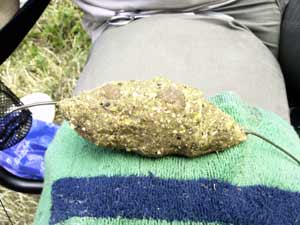 Grundfutter und halbierte oder Mini-Boilies in das Blei reinkneten. |
