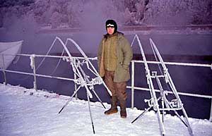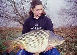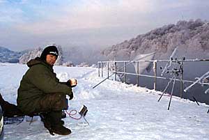 Weil ich für die Futterkampagne und auch beim Angeln als Köder sehr kleine Boilies benutzte, passe ich auch meine Montage dem an. Seit Jahren benutze ich nur die Safety-Bolt-Montage und nie kleiner als 150 g. In der restlichen Jahreszeit benutze ich Kombi Rig mit 20 cm 25 lbs Amnesia und 2 cm 35 lbs Krystonite und jetzt in der Winterzeit 25 cm 20 lbs Amnesia und 5 cm 25 lbs Krystonite. Die meistbenutzte Hakengröße ist die Größe 6, beködert mit 1-2 Minis oder einem 14 mm Boilie und natürlich mit PVA-Stringer oder PVA-Beutel dazu. Die Ruten, die ich konstant am Neckar benutze für die mittlere Distanz sind 12` 2 lbs mit parabolischer Aktion, die mir ein fantastisches Gefühl beim Drillen großer Karpfen verleiht. Schlagschnur benutze ich nie, deswegen habe ich auf der Rolle durchgehend 0,40 mm monofile Schnur. Neben Futter und Ködern ist noch einer und vielleicht der wichtigste Faktor für einen guten Fang am Neckar der Wasserstand. Ich möchte nicht daran denken wieviel Futter ich sonst in den Neckar reingekippt habe ohne angeln zu können, weil der „Bach“ mir einen Strich durch die Rechnung gemacht hat. Zur Zeit reicht ein eintägiger Dauerregen aus es unmöglich zu machen am Neckar zu angeln. Konstanter Wasserstand mit winzigen Erhöhungen ist sehr gut für einen guten Fang. Mit leicht erhöhtem Wasserstand sind die Karpfen mehr in Bewegung und automatisch haben sie einen höheren Nahrungsbedarf. In der Winterzeit sind außer dem Wasser-bestand auch noch die Wetterbedingungen entscheidende Faktoren für den Erfolg. Mäßige Niederschläge und Wärmeausbrüche haben sehr positive Wirkung auf den Appetit des Karpfens. Nur im Fall einer Krankheit oder Abwesenheit könnte es passieren, daß ich nach 3 –4 Nächten mit einer Temperatur von + 4° C nicht am Wasser bin. Es geht nicht darum, daß es mir angenehm ist nur bei Plus-graden zu angeln, ich habe auch schon bei –15° C die ganze Nacht am Wasser verbracht, sondern es geht darum, daß nach 3 – 4 Nächten mit + - Graden die Wassertemperatur sich um mindestens 2 Grad erhöht, was sehr vielver-sprechend klingt.