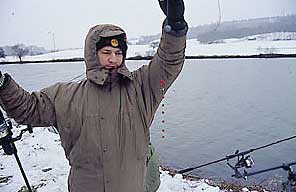In der Winterzeit fische ich gern wenn Schnee liegt, weil mir dies ein ganz anderes Gefühl verleiht, wie das Fischen beim sommerlichen Grün. Seitdem ich in Deutschland lebe habe ich leider noch keinen richtigen Schnee gesehen, weil in meinem Wohnort der Schnee schneller schmilzt wie er fällt. Es war bisher immer so, wenn ich mit einer Futterkampagne anfing während Schnee lag, war er bis zum Tag des Angelns auch schon wieder weggeschmolzen. Vor ca. 2 Jahren konnte ich im Dezember eine Futterkampagne durchziehen und mit angeln beim Schnee beginnen. Ich hatte mit meinem Angelkollegen sehr viel Schwierigkeiten bei diesem Schneesturm unser Wohnzimmer aufzubauen. Als alles fertig war und die Köder auf dem Spot platziert, kamen mir kindliche Ideen auf die Marian nur mit Kopfschütteln reagiert hat. Ich wollte unbedingt einen Schneemann bauen und die dazu gehörende Schneeballschlacht machen und natürlich haben wir unser Angelgebiet mit unseren Namen im Schnee markiert (man weiß, wie das Kinder machen). Ich hatte irgendwie das Gefühl, daß die Fotos mit dem Karpfen im Arm neben dem Schneemann sehr witzig werden können und daß man nicht jedes Jahr diese Chance hat auf solche Bilder. Als alles fertig war gingen wir in unsere „Iglus“ und wärmten uns mit ein paar Gläsern Glühwein auf. Der Wind draußen klang wie eine Sinfonie für uns, bis ich wegen einem riesigen Döbel raus mußte. Ein paar Stunden später kam dieser lang gewünschte und erwartete Run. Ich denke, daß ich beim Rutenanhieb aufgeregter war als bei meinem ersten Karpfendrill und ich betete nur nicht den Fisch zu verlieren. Der Fisch, wahrscheinlich auch aus dem Winterschlag herausgerissen, kämpfte wie ein Verrückter. Mit wackeligen Knien hatte ich nach 15 – minütigem Kampf den Fisch über den Kescher gezogen. Beim Versuch ihn bis zu der Matte zu tragen, sah ich daß es sich um einen nicht schlechten Fisch handelt , was mir einen Freudenschrei entriss.