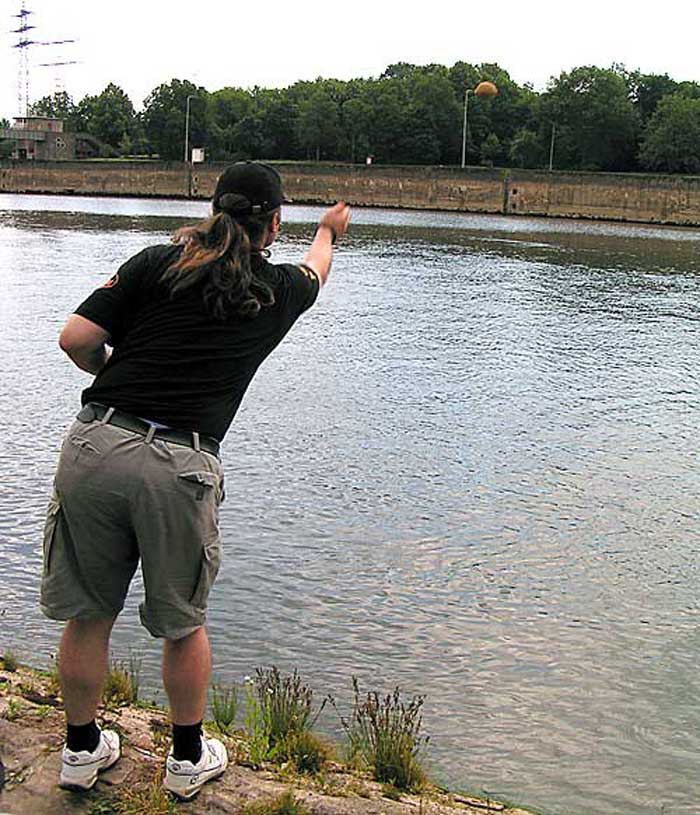 Noch bevor wir an das Wasser kamen wussten wir schon, dass die Strömung an der Stelle, die wir ausgesucht haben ziemlich "hart" war. Wir wollten direkt unter einer Schleuse fischen, wo das Wasser recht schnell floss. Obwohl Tomi die Stelle kannte haben wir loten müssen, um eine Rinne oder eine Unebenheit zu finden an der sich die Nasen überwiegend aufhalten. Nach längerem Loten fanden wir endlich das was wir suchten. Ich hatte noch meine 11 m. Steckrute dabei und entschloss mich in einer Entfernung von ca. 10 m. von dem Ufer zu fischen, wo das Wasser etwas langsamer floss und Tomi fischte in einer Rinne, die gerade ca. 5 m. von dem Ufer weg war mit natürlich deutlich stärkerer Strömung wie bei mir. Dann sind zwei Entscheidungen gefallen was die Futterkampagne betrifft, nämlich Tomi wollte grössere Kugeln füttern, die auch etwas fester gedrückt waren, in deren Mitte er noch ein Stein reindrückte um an Gewicht zu bekommen. Er fütterte eine Stelle punktgenau um die Fische auf einem kleinen Raum zu behalten. Ich machte kleine Kugeln, Steine ließ ich weg, fütterte fluss-aufwärts und habe versucht eine längere Spur anzulegen, so dass ich meine Montage über längere Stecke treiben lassen kann, um mir die Chance auf einen Biss zu erhöhen.