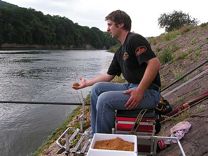 Um die Bisse an der Pose zu erkennen, brauchen wir die Fische am Platz, kurz gesagt, dass das Lockfutter und die Art wie man es anfüttert eine grosse Rolle spielt, ob man Erfolg hat oder nicht. Da ich diesen Abschnitt nicht kannte, habe ich mich für eine ausprobierte Mischung entschieden, die bis jetzt an allen Gewässern gute Resultate gebracht hat. Ich mischte 1:1 "Plus 4000" und "Comet", das Futter das Deutsche Top Angler für die Fa. Angelsport Ofenloch entwickelt haben. Dazu mischten wir noch Pulverlockstoff "Vanille"und ein wenig Intense Sweetener aus dem Programm "TK Baits of Glory". Tomi gab noch zu seiner Hälfte dieser Mischung das Futter von Gica Radovic (bekannter serbischer Wettkampfangler) zu, 500gr. auf 1 kg., mit der er bei kälterem Wasser gute Erfahrung gemacht hat. Für die ausgesuchte Stelle und die Art wie wir geangelt haben war noch wichtig, dass das Futter die Konsistenz hat die wir brauchen. Wichtig war, dass wir mit leichtem Handdruck die Kugeln bekommen, die bis auf Grund sinken ohne dass sie im Mittelwasser zerfallen. Das Futter darf aber nicht zu hart werden, sondern muss auch locker sein und auf dem Grund langsam zerfallen, wobei sich kleine Partikel lösen, die die Fische nur anlocken, ohne sie satt zu machen. Von großer Bedeutung ist, wie man das Futter macht. Es ist erwünscht das Futter mehrmals anzufeuchten, bzw. Anfeuchten-10 Minuten ziehen lassen, dass alle Zutaten schön feucht werden, und das 2-3 mal zu wiederholen. Es ist wichtig, dass das Futter nicht trocken ist, sonst zerfallen die Futterkugeln schon beim Aufschlag auf der Wasseroberfläche. Das Futter darf aber auch nicht zu nass sein, sonst wird es zu klebrig und zersetzt sich sehr schwer am Grund was nicht Sinn der Sache ist.