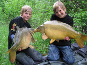 war so flach, so daß wir zuschauen konnten wie die Fische fraßen. Beim zweiten Beep schafften wir es dann auch den Fisch aus dem Wasser zu bringen. ENDLICH unser erster Karpfen 2010! An diesem Platz fingen wir am selben Tag nochmals zwei Karpfen. Jetzt war es soweit: auch unser Papa war wieder heiß. Für diesen Tag war unsere Tour beendet, aber wir haben dann gleich nochmals für den nächsten Tag zwei Plätze angefüttert. Den Platz an dem wir erfolgreich waren und einen Platz an dem Bäume im Wasser liegen.