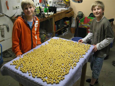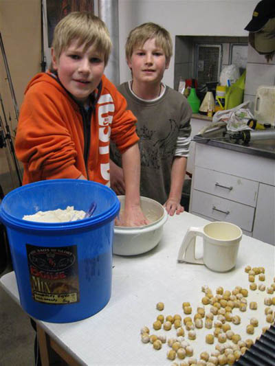 Die Werkstatt wurde dann zu unserer Boilieküche. Das Wetter war immer noch beschissen, aber so hatten wir wenigstens Zeit in Ruhe unsere Boilies zu drehen. Wir verarbeiteten an einem Nachmittag den Good Oldy-Mix mit 50 Eiern und rollten 10 und 16 mm