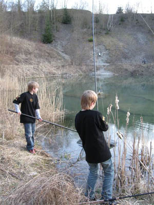 die andere Rute ab und dann ging der Spaß erst richtig los! Der Fisch hatte sich nämlich dazu entschlossen sich unter den Bäumen zu verstecken, aber für was haben wir denn unseren Papa dabei? Der kann ja wohl mal ne Runde baden gehen, schließlich hatte das Wasser immerhin 9°C. Nach einer viertel Stunde war auch dieser Fisch draußen. Leider war dann unser Angeltag beendet, denn unser Papa war dem Erfrieren nahe, (ist halt doch ein kleines Weichei!).